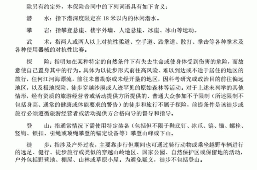 此外,因运动项目界定引发的保险争议往往也与投保人对保险产品中的详细规定不了解有关。调查发现,有的旅行意外险产品明确将潜水、跳伞等高风险运动列为不承保项目,有的则将它们单列在高风险运动承保项目中。可是,即便保险公司表示承保,仍旧有细则。以潜水为例,部分产品在细则中明确,仅承保18米以内的休闲潜水,深潜运动需额外投保附加险。与之类似,攀岩、蹦极、热气球等活动的保障差异也不小,不少保险产品明确,仅承保特定场地的合规活动。