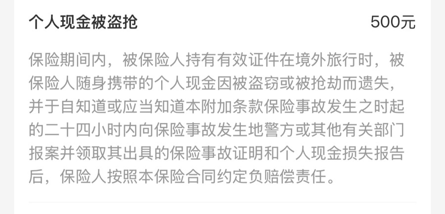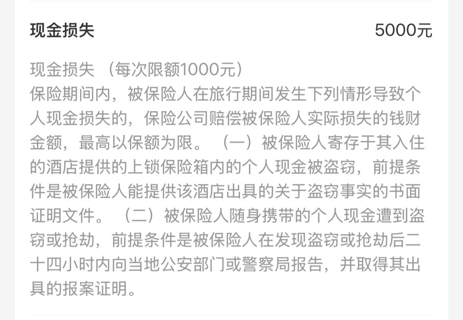 再如,“财产损失赔偿”是大部分旅行意外险都涵盖的项目,可细则有不小差异。有的产品明确,投保人若能证明在旅行期间存放在酒店保险柜中的现金被盗窃,或者随身携带的现金遭到盗窃或抢劫,保险公司负责理赔;有的产品却没有明确酒店内现金被盗的理赔条件。